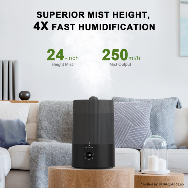 The humidifier creates a mist at most 250ml/h to humidify quickly and ease dryness and discomfort. With a 4L capacity, the humidifier functions up to 50 hours on a setting for low mist, covering a zone of 415 square feet to give you the ideal humidity level suitable for you.