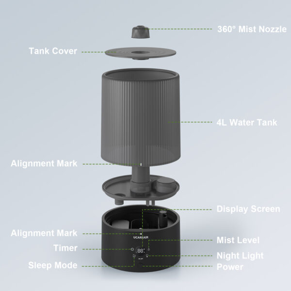 The easy to clean humidifier features a 360° rotating nozzle, allowing for effortless adjustment of the mist direction to balance indoor humidity. It automatically shuts off when water reaches a low level, avoiding potential risks and damage.