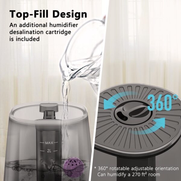 The top-fill design of this small humidifier makes refilling a breeze. You don’t have to turn over the tank anymore-just pour water directly. The tank’s wide 4-inch opening not only makes refilling easy but also makes cleaning effortless.